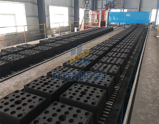 1、全自動造型機打出來砂型直接在鏈板線上循環輸送,可以是單排雙列,也可以雙排雙列;